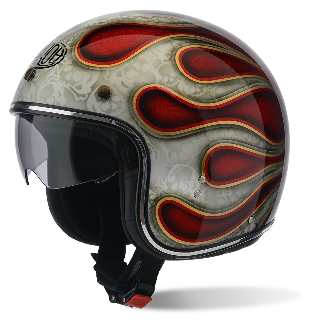 Riot is the proposal dedicated to the vintage style and cafè racer. The shell, made with the new PRE-PREG fibre technology, enables the limiting of weight, ensuring the rider a safe and light ride and reducing fatigue and stress on the neck and shoulders. Riot is also equipped with an approved retractable sun visor, 50% tinted, offering maximum protection from the sun and some accessories can sold separately, such as the long face shield, which covers the face up to the chin, and the peak, applicable thanks to the three buttons on the front part of the shell. Utmost care has been taken within the inner lining, removable and washable, made from fabrics of the latest generation, highly breathable and antibacterial. Completing it all is the practical and manageable micrometric retention system.